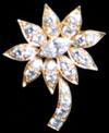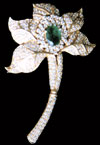A flower brooch centering on a 2.04 cts of oval cut emerald, within round cut diamond cluster and delicately carved leaves & stem weighing 3.87 cts, mounted in 18K gold.