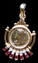 A pendant centering on a gold coin, terminating with round cut diamonds of 0.14 cts & baguette cut rubies of 0.52 cts, mounted in 18K gold.