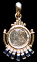 A pendant centering on a gold coin, terminating with round cut diamonds of 0.14 cts. & baguette cut sapphire of 0.55 cts, mounted in 18K gold.