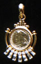 A pendant centering on a gold coin, terminating with round & baguette cut diamonds of 0.44 cts, mounted in 18K gold.