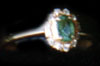Ring designed as an oval cut emerald of 0.36 cts., within a frame of round cut diamonds weighing 0.14 cts., mounted in 18K gold.