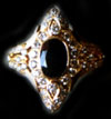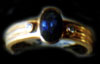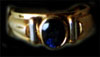 Ring centering on an oval shaped solitaire sapphire of 1.49 cts, surrounded by carved shoulders of white and yellow 18K gold.