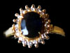 Ring centering on an oval shaped sapphire, within a round cut diamond frame, mounted in 18K gold.