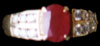Ring centering on an oval shaped ruby, flanked on both sides by round cut diamonds, aesthetically placed. Mounted in 18K gold.