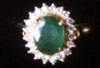 Ring dominated by an oval shaped ruby, within a round cut diamond frame, mounted in 18K gold.