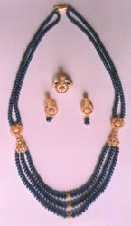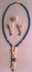 Necklace front designed as an elongated pattern of round & baguette cut diamonds, enhanced by oval sapphires & sapphire beads, joined to a single strand sapphire bead back chain and 18K gold clasp, with matching earrings & a ring.
