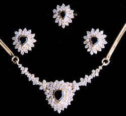 flanked by two diamond rows, joined to an 18K gold back chain, with matching ear clips & a ring.