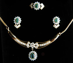gold openwork pattern, slinging an oval emerald, within a diamond frame, joined to an 18K gold