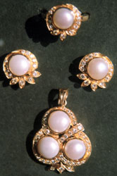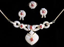 The necklace pendant front designed as alternate columns of round & baguette cut diamonds, suspending from a round cut diamond cluster, enhanced by a diamond set loop, mounted in 18K gold. Available with a pair of similar earrings and a ring.