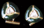 A pair of cufflinks, each designed as a modified diamond (of 0.75 cts), surrounded by 18K gold and green enamel work.