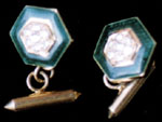 A pair of cufflinks hexagonal in shape, centering round cut diamonds of 0.53 cts, bordered by green enamel work, mounted in 18K gold.