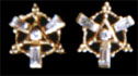 Each earring centering on a round diamond, within a triangular gold frame, surrounded by three baguette cut diamonds and 18K carved gold pattern.