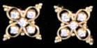 Each designed as five round cut diamond set flower, enhanced by carved 18K gold pattern.