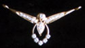Pendant front designed as diamond set motif, flanked by two rows of diamonds to leaf shaped diamond spacers, mounted in 18K gold.
