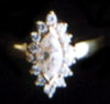 Ring centering on an exclusive marquise cut diamond, within a round cut diamond frame,