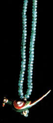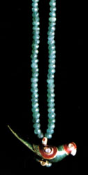 Necklace centering on a three dimensional parrot motif, enhanced by red & green enamel work, joined to a single strand of emerald beads & 18K gold clasp.
