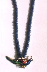 Necklace front designed as three dimensional peacock motif, joined with a single strand sapphire bead back chain & a gold clasp.