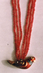 Necklace centering on a three dimensional Kundan Meena bird motif, joined with a three strand spiral beads back chain & gold clasp.