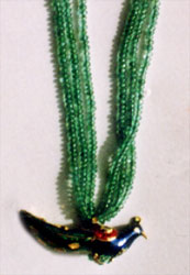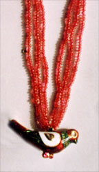 Necklace centering on a three dimensional Kundan Meena bird motif, joined with a three strand spiral beads back chain & gold clasp.