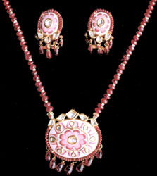 Necklace front designed as an oval shaped motif of pink enamel work, suspending spinal
